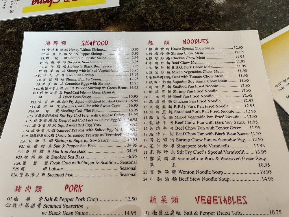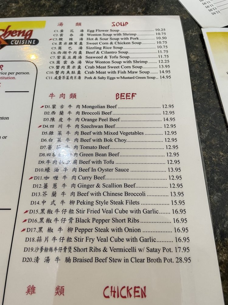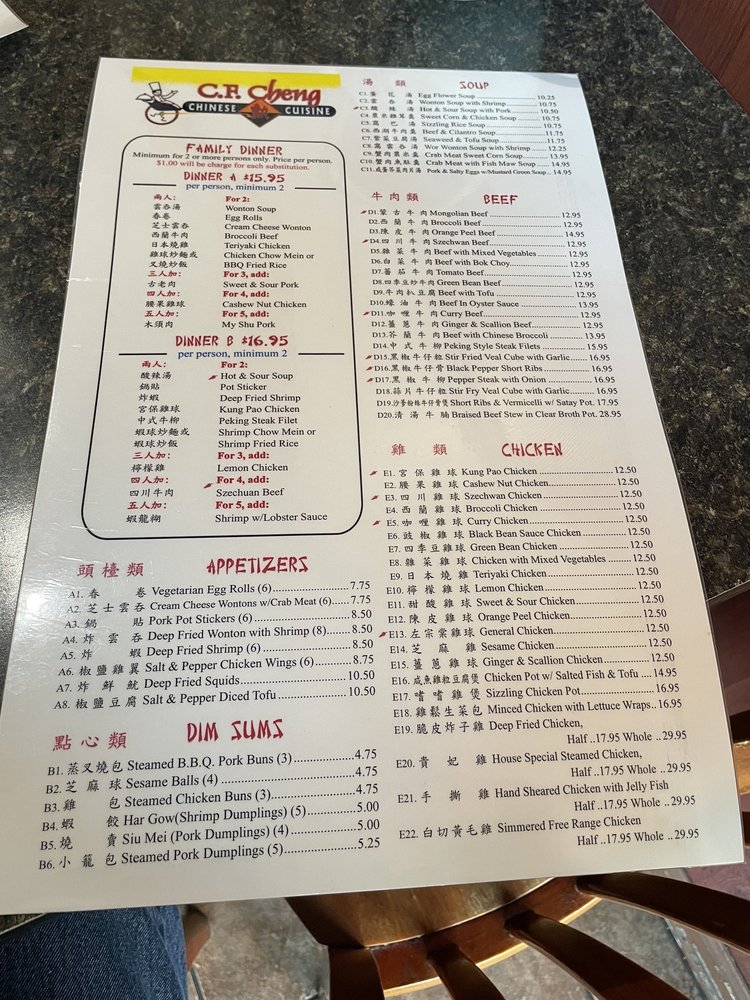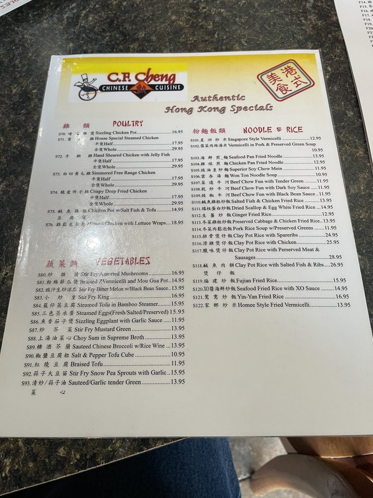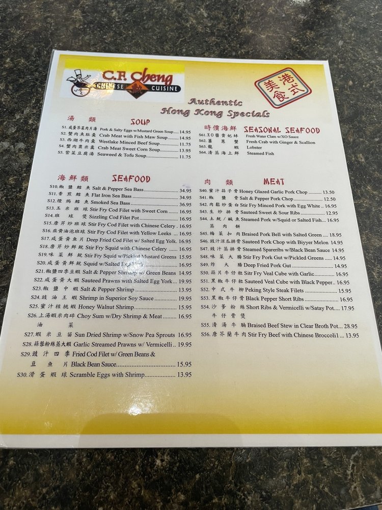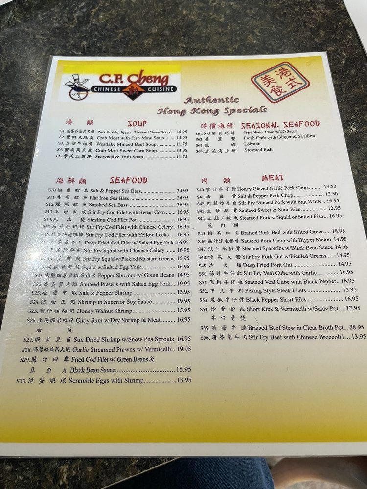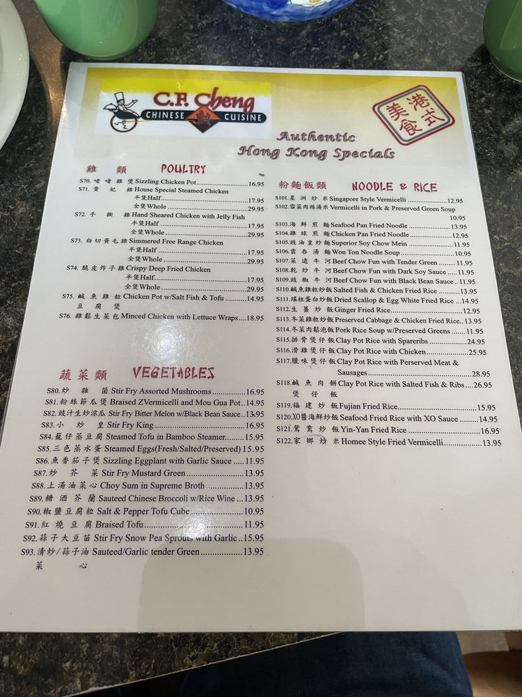 Introducing CF Cheng, a Chinese seafood restaurant located in Sacramento, CA. This casual dining spot offers a variety of Chinese dishes, including flavorful Kung Pao Chicken, Hand Sheared Chicken with jellyfish, and Braised Tofu with Black Mushrooms. The menu features a range of dim sum options like Haw Gow and Siu Mei, as well as vegetarian egg rolls and chicken pot stickers. Customers appreciate the generous portions and authentic flavors of dishes like Honey Garlic Pork Chops and Crab Meat with Fish Maw Soup. The restaurant provides a pleasant dining experience with attentive service, gender-neutral restrooms, and free Wi-Fi. Overall, CF Cheng is a must-try for those looking for traditional Chinese cuisine with vegan and vegetarian options available.